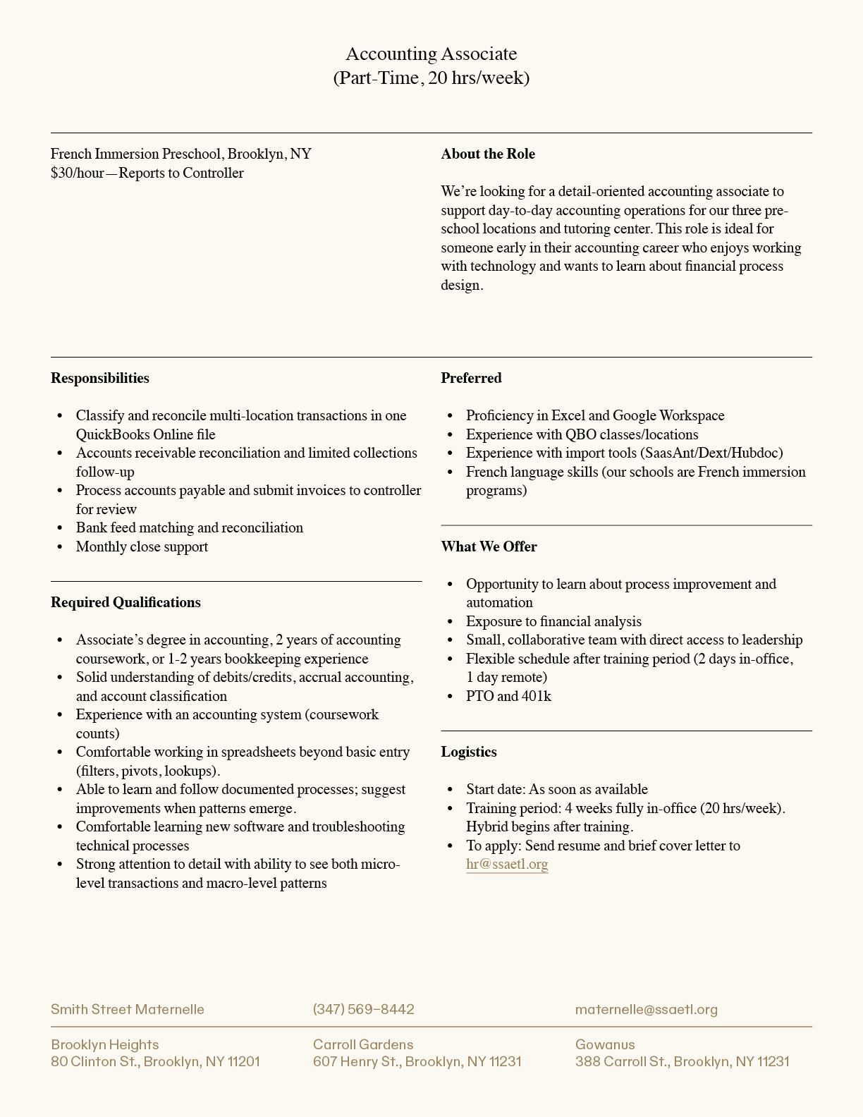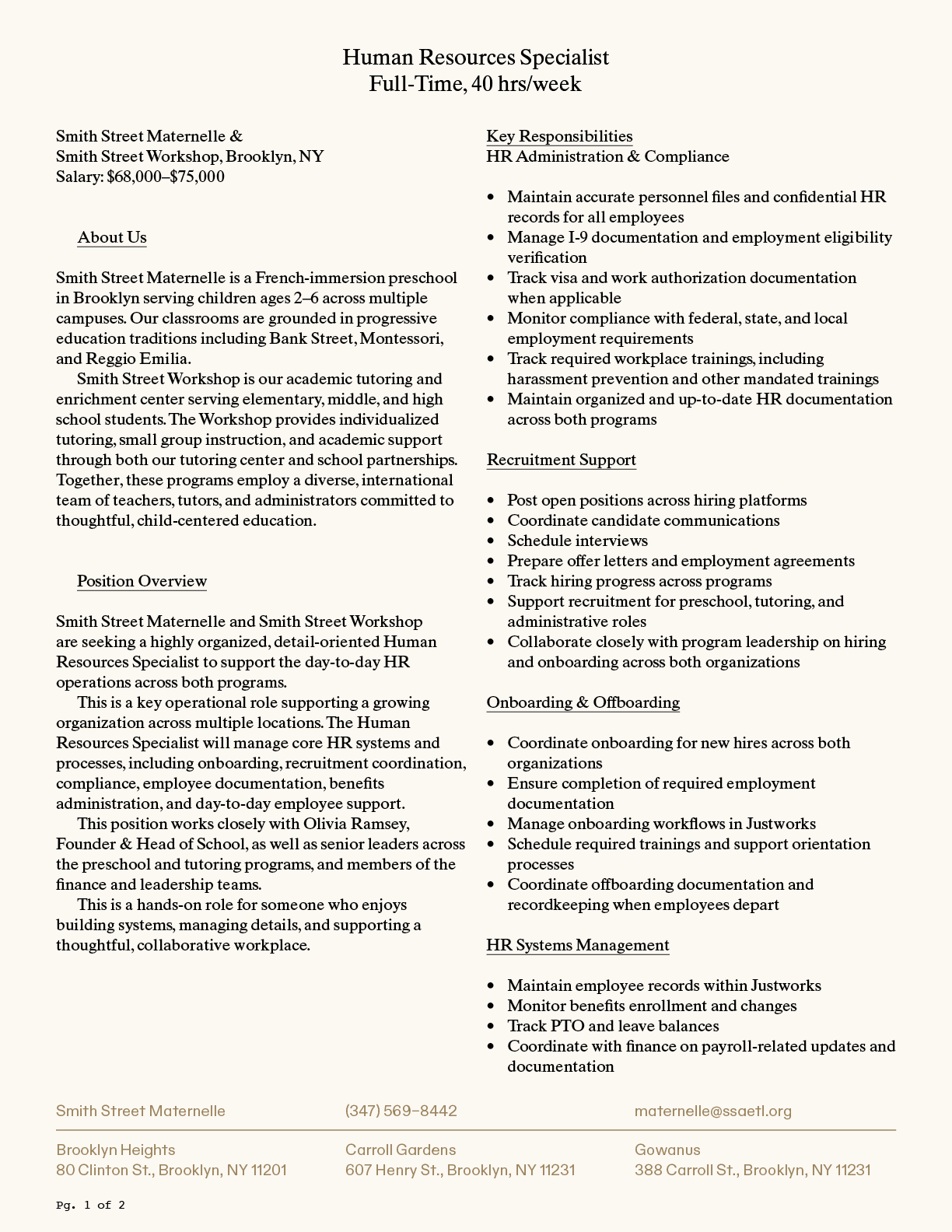 Smith Street Maternelle, is an independent French-American preschool in Brooklyn with campuses in Brooklyn Heights, Carroll Gardens, and Gowanus. Our bilingual curriculum emphasizes a Reggio-Emilia inspired, holistic approach to education with artistic expression as the foundation of a child’s social emotional development. We seek individuals who are passionate about progressive bilingual education for both part-time and full-time employment.